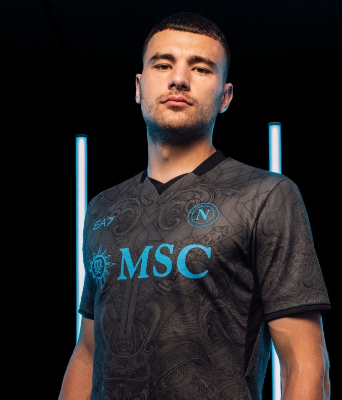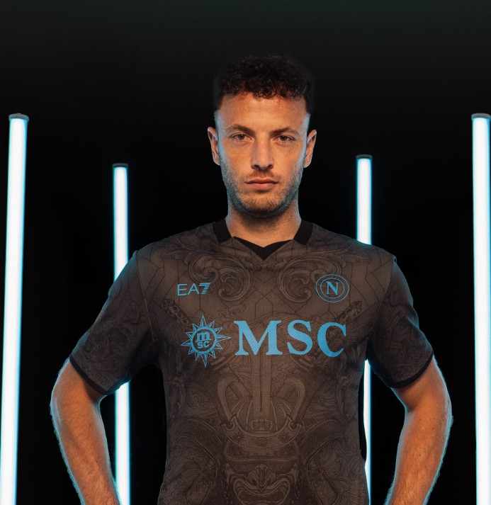 这款球衣是那不勒斯与EA7合作的成果,看起来像是一种现代盔甲,向武士形象致敬。球衣上融合了兜甲、面具和武士刀等独特细节,象征着力量与保护的含义,同时也体现了不同文化间的理想结合。